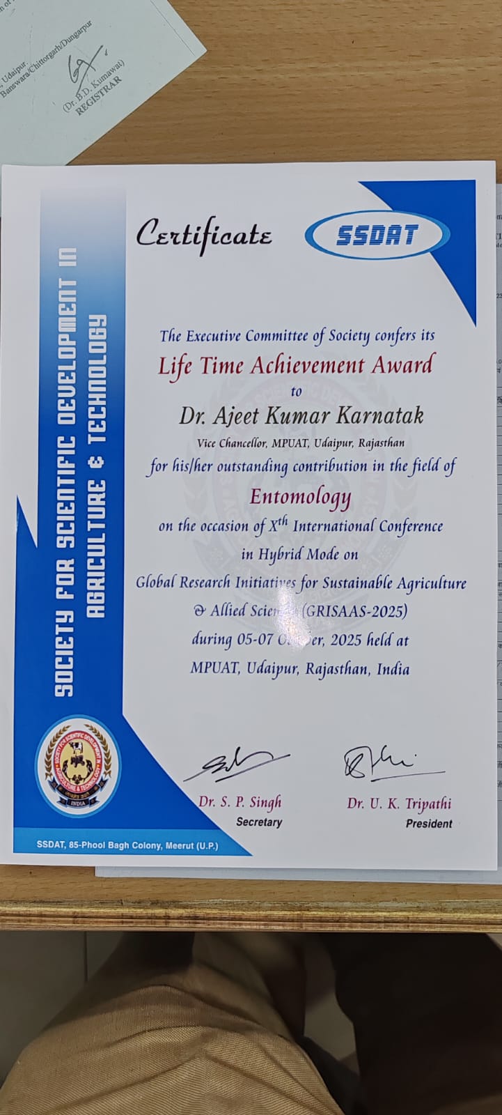 उदयपुर,आस्था फाउंडेशन, मेरठ एवं सहयोगी संस्थानों द्वारा आयोजित “सतत कृषि एवं संबद्ध विज्ञान के लिए वैश्विक अनुसंधान पहल (जीआरआईएएएस-2025)” अंतर्राष्ट्रीय सम्मेलन में महाराणा प्रताप कृषि एवं प्रौद्योगिकी विश्वविद्यालय के कुलपति डॉ. अजीत कुमार कर्नाटक को लाइफ टाइम अचीवमेंट अवॉर्ड से सम्मानित किया गया। यह आयोजन प्रसार शिक्षा निदेशालय, उदयपुर में हुआ।