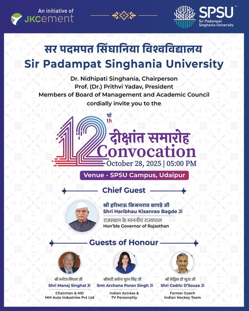 उदयपुर, सर पद्मपत सिंघानिया विश्वविद्यालय (SPSU), उदयपुर में 12वां दीक्षांत समारोह आगामी 28 अक्टूबर 2025 को शाम 5 बजे विश्वविद्यालय परिसर में आयोजित किया जाएगा।
