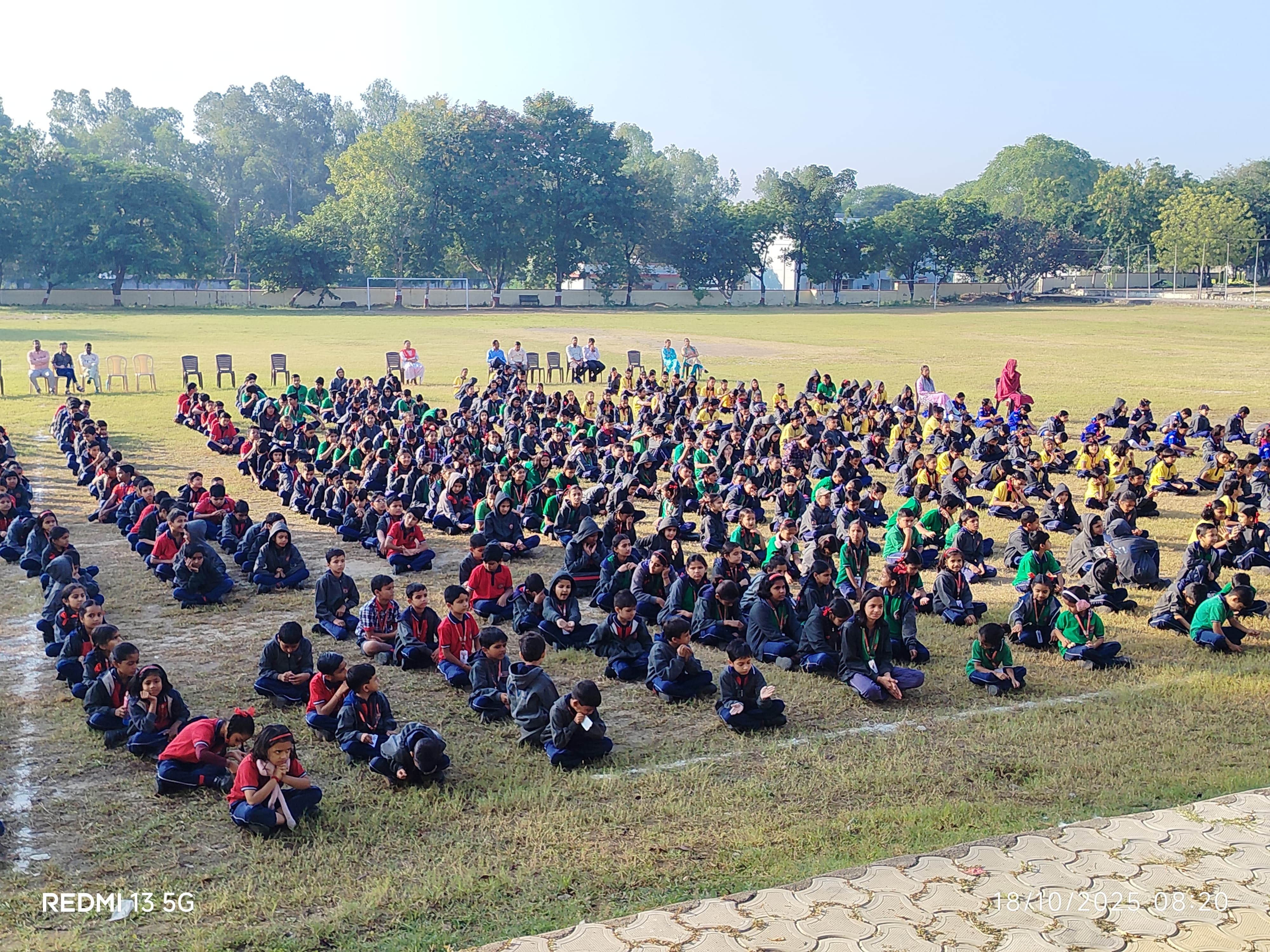 कार्यक्रम का शुभारंभ विद्यालय के हिंदी प्राध्यापक अनुराग जी द्वारा स्वागत उद्बोधन से हुआ। उन्होंने परिषद के वरिष्ठ सदस्य एवं जल संरक्षण व नशा मुक्ति अभियान के अग्रदूत, वाटर हीरो डॉ. पी.सी. जैन का परिचय कराया। डॉ. जैन ने विद्यार्थियों को नशा निवारण का संदेश दिया और सभी को राष्ट्रभक्ति से ओत-प्रोत कर देने वाला गीत “हम करें राष्ट्र आराधन” गवाया, जिससे पूरा प्रांगण देशभक्ति के सुरों से गूंज उठा।